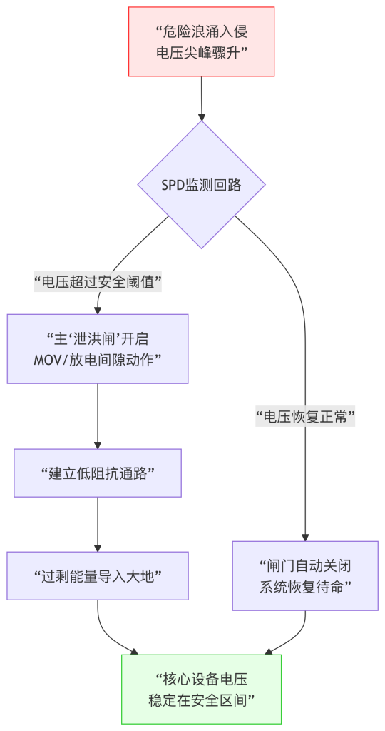 浪涌保护器的核心使命是:在亿分之一秒内,为过高的电压找到一条“安全的泄洪道”。